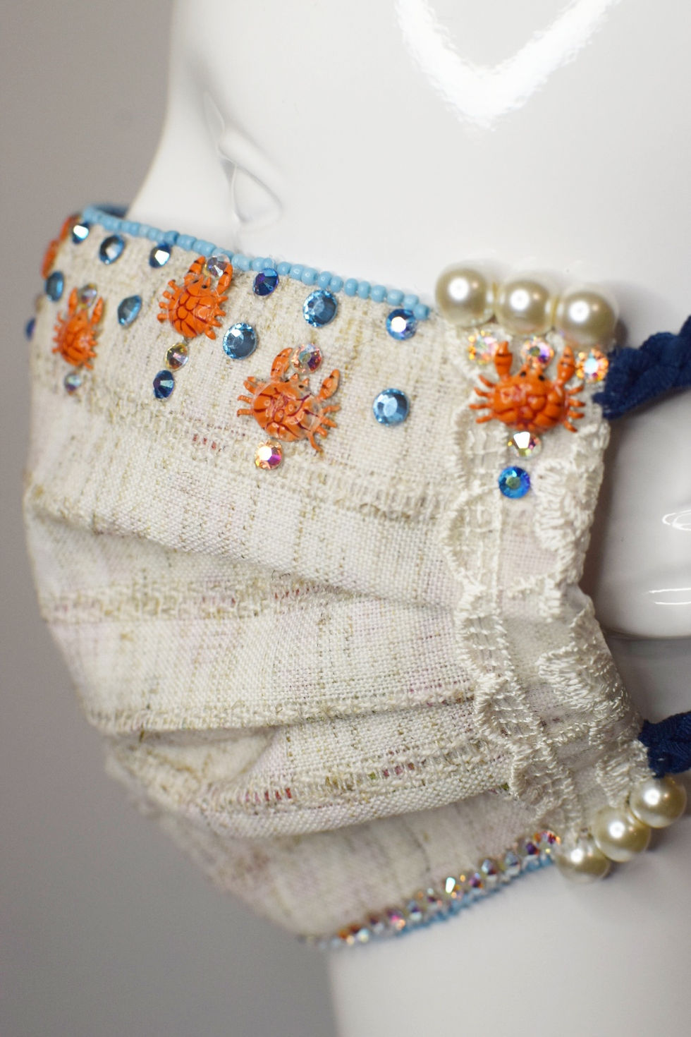 Crabs at sea glam facemask, linen lined in Liberty print cotton, Swarovski crys
